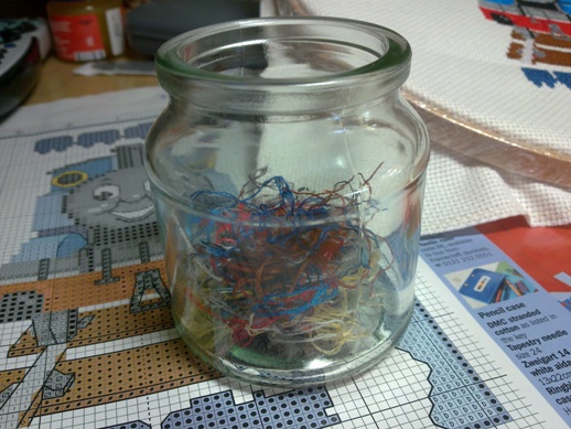 As you can see it has the reds, blues and black from Thomas the Tank Engine on top and at the bottom it has the pink and green colours from the "Edwardian Lady's Country Diary" foxgloves that I am also stitching. I have only been collecting my threads in this jar since the middle of December 2010 when I first signed up for the TUSAL.